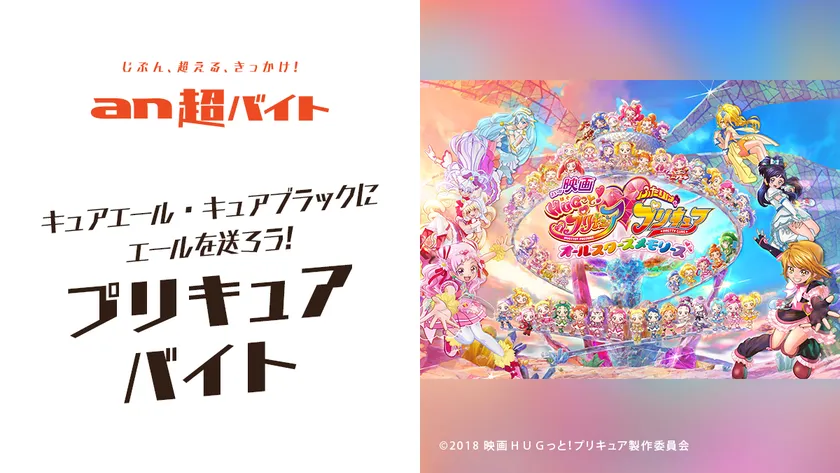 総合人材サービス、パーソルグループのパーソルキャリア株式会社(旧社名:インテリジェンス、本社:東京都千代田区、代表取締役社長:峯尾 太郎)が運営するアルバイト求人情報サービス「an」< https://weban.jp/ >は、思わず挑戦してみたくなるような「an超バイト」の新企画として、10月27日(土)公開の劇場版最新作『映画HUGっと!プリキュア・ふたりはプリキュア オールスターズメモリーズ』公開初日のイベントに参加して、キュアエール&キュアブラックにエールを送る“プリキュアバイト”を2名募集します!報酬は、日給55,000円を支給。さらに非売品パンフレットもプレゼントします。