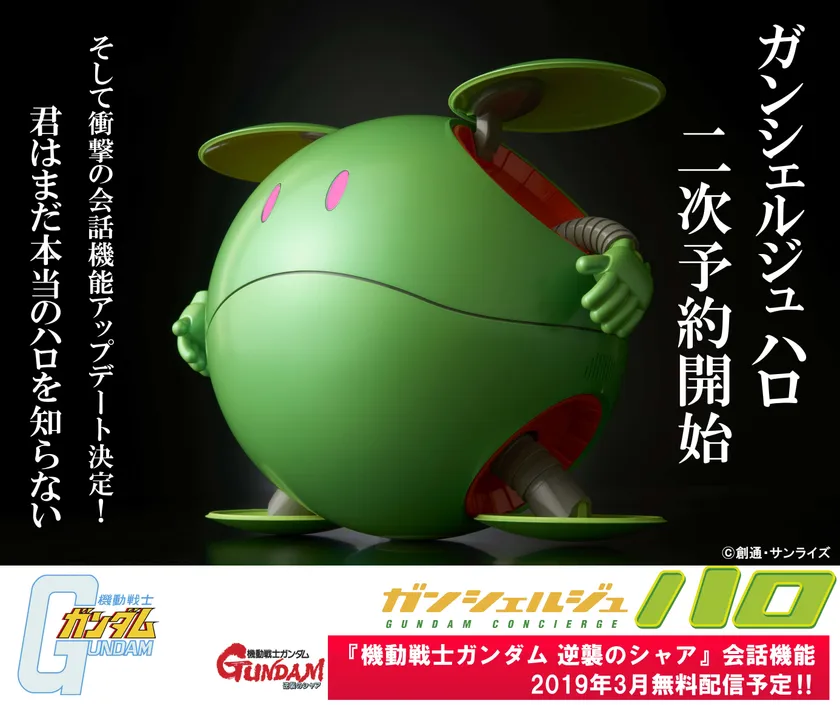 サーバーを介して会話を楽しむコミュニケーションロボット『ガンシェルジュ ハロ』の特徴を生かし今回更なる会話機能追加アップデートを行うことが決定しました。1988年に公開された劇場版アニメ作品『機動戦士ガンダム 逆襲のシャア』に関する会話機能を2019年3月予定で無料配信いたします。テレビアニメ版『機動戦士ガンダム』の会話機能はそのままに、『ガンシェルジュ ハロアプリ』での切り替えにより各作品の会話を楽しむことが可能です。