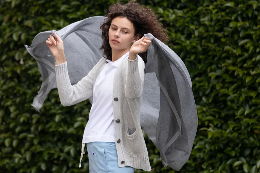 実際に、これだけ軽くて薄いと気になってしまうのが保温性です。しかし【tennyo(テンニョ)】はカシミヤ100%なので保温性は抜群です。通常のストールのように首元に巻くだけでなく、色々な場面で使用出来ます。映画館や店内など足が冷えがちな場所で、ひざ掛けとしても使用できますし、サラッと羽織りで使うのも大変オススメです。