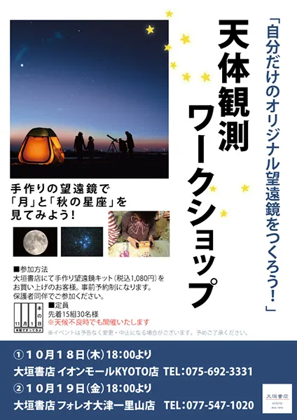 2018年10月18日(木)・19日(金)に大垣書店で開催の 「自分だけのオリジナル望遠鏡をつくろう!」 天体観測ワークショップ ~秋の星空を見てみよう~に協力