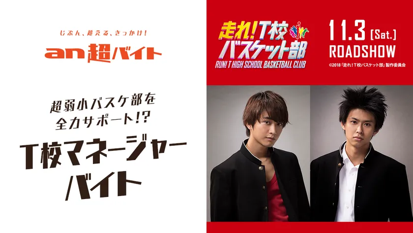連戦連敗の弱小バスケ部の成長と奇跡を描いた、シリーズ累計120万部を超える青春ベストセラー小説を、志尊淳や佐野勇斗ら人気若手俳優陣の豪華キャスティングで実写化した、2018年11月3日(土)公開の映画『走れ!T校バスケット部』が「an超バイト」とスペシャルコラボ!T校バスケ部の一日限定マネージャーとして、イベントの裏側をサポートしていただくバイトを大募集します!