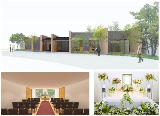 この度、阪急山田駅から徒歩6分の立地に、小規模で暖かい家族葬向けのフューネラルホール(葬祭会館)「エテルノ阪急千里」を2019年1月下旬に開業します。同施設では、周辺の緑豊かな環境に配慮して、“1日1組”故人様をお花で安らかにお見送りします。花祭壇のプランでは、株式会社日比谷花壇(代表取締役社長:宮島 浩彰)によるデザインの花祭壇をご提供します。また供養品袋等を紙製にするなどして、ビニールやプラスチックの使用を抑制するなど、自然にやさしい会館づくりを目指します。