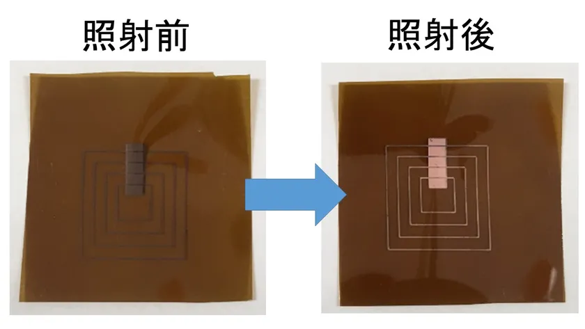 今回の技術は、大気中で銅の処理を可能とし、数ミクロン幅の微小な配線形成が有機樹脂上に形成できるものです。従来はレーザー照射に耐えられるガラスなどの素材にしか形成できませんでしたが、これにより柔らかく耐熱性が低い有機樹脂への銅配線が可能となります。