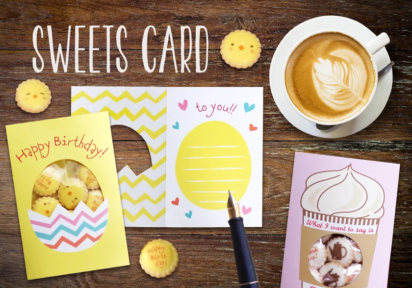 ひよこの顔がプリントされたアイシングビスケットや、バースデーメッセージ入りのラムネなどが窓から見えるグリーティングカード。「スイーツカード」はそんな、お菓子とカードがセットになった、プチギフトにもなる新しいタイプのメッセージカードです。中に入っているお菓子のデザインもカードとマッチしたイラストになっていて、見た目も楽しめるアイテムです。