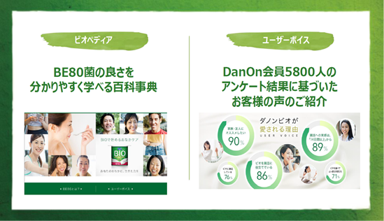 「ダノンビオ」の公式ウェブサイトでは、新たに「ビオペディア」ページを新設しました。ビオペディアは、文字通り、ダノンビオの百科事典を目指し、BE80菌やおなかの健康に関する情報を順次更新していく予定です。また、ダノンビオユーザー5,800人(DanOn会員)のご意見をご紹介している「ユーザーボイス」も公開しましたので、合わせてご参照ください。