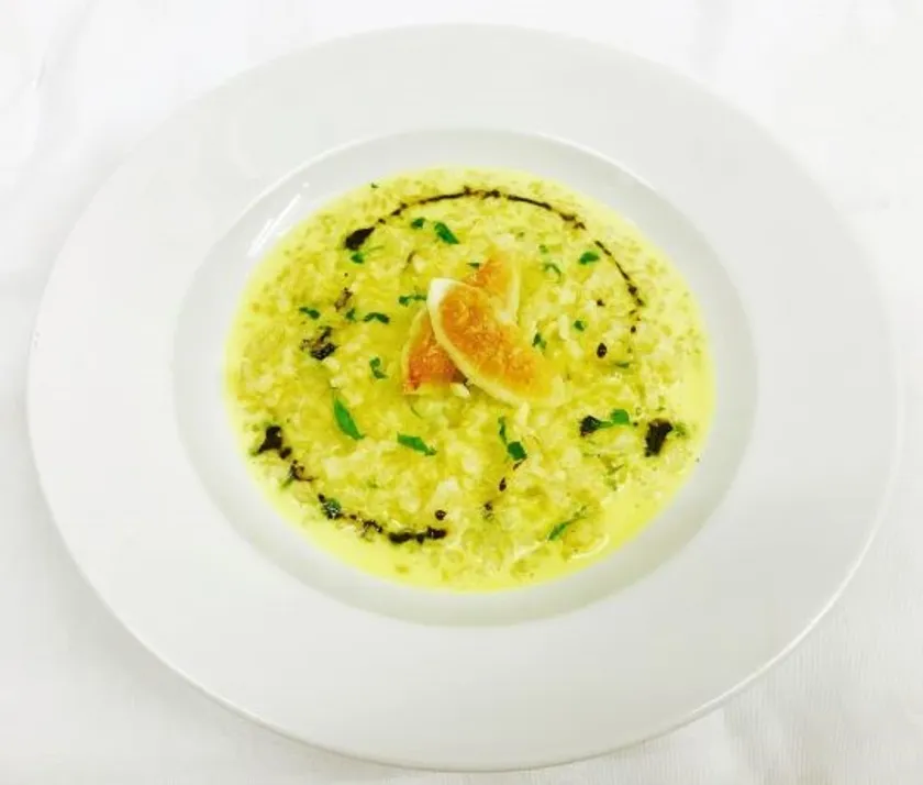 スーパー大麦と国産有機玄米を、乳製品を使わずにつくったマロンクリームでリゾットに仕上げました。イチジクの甘みとバルサミコの酸味との相性をお愉しみください。
