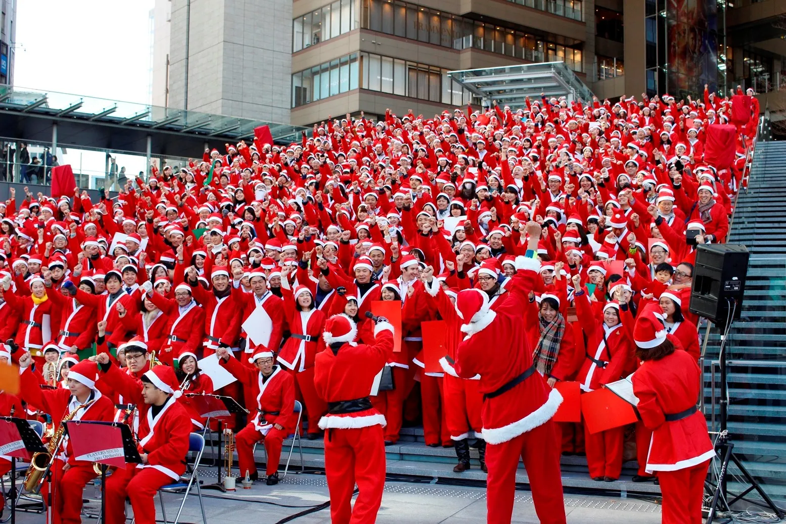 一般公募による来街者の皆さまとグランフロント大阪の従業員がサンタクロースに変身しハンドベルを持って階段に整列。世界最大規模となる約1,000人での壮大なハンドベル演奏に挑戦します。