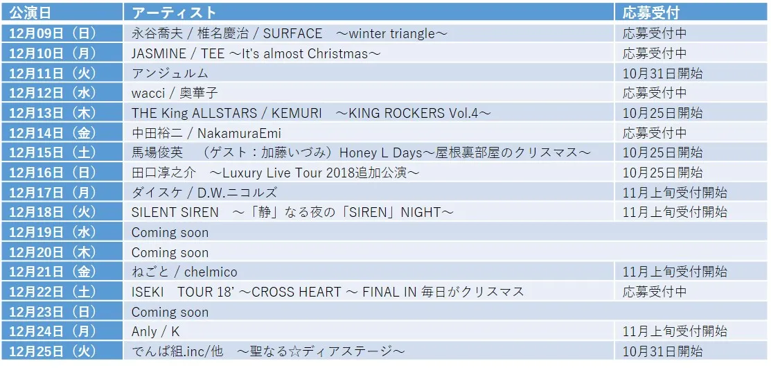 株式会社エアトリ(本社:東京都新宿区、代表取締役社長:吉村 英毅、以下エアトリ)らが運営する、総合旅行プラットフォーム「エアトリ」(URL:https://www.airtrip.jp/)は、12月9日(日)から12月25日(火)に開催される協賛音楽イベント『エアトリpresents 毎日がクリスマス2018』について、参加アーティスト第3弾を発表します。
