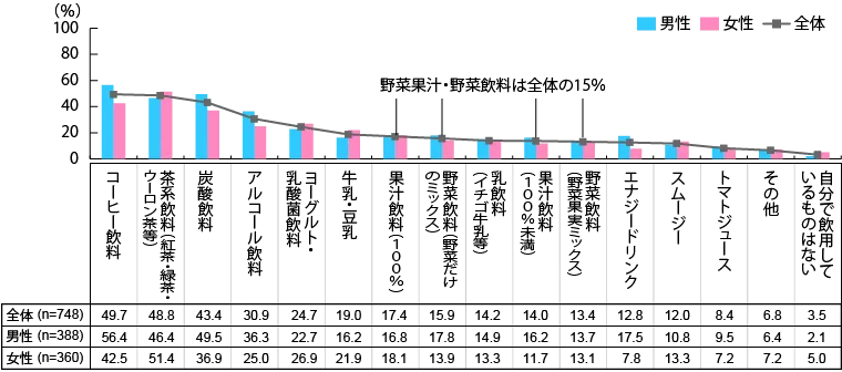 野菜飲料・果汁飲料や、スムージーを飲用する理由に「野菜不足解消のため」「健康にいいから」が選ばれたのは、野菜そのものを摂取するのではなく野菜飲料等を摂取することで手軽に栄養バランスをよくし、健やかに過ごしたいという思いが反映されているのかもしれません。