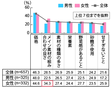 野菜飲料・果汁飲料を購入するときの重視点は、全体で「価格(46.3%)」が最も高く、次いで「メイン素材の組み合わせの良さ(28.5%)」「素材の種類の多さ(26.9%)」となりました(図2)。男女別でみると男性は女性に比べて「価格」や「栄養素」を、女性は「素材の組み合わせ」や「野菜感」「甘すぎないこと」を重視していました。「メイン素材の組み合わせの良さ」では男性より、女性のほうが10ポイント以上高い結果となっています。