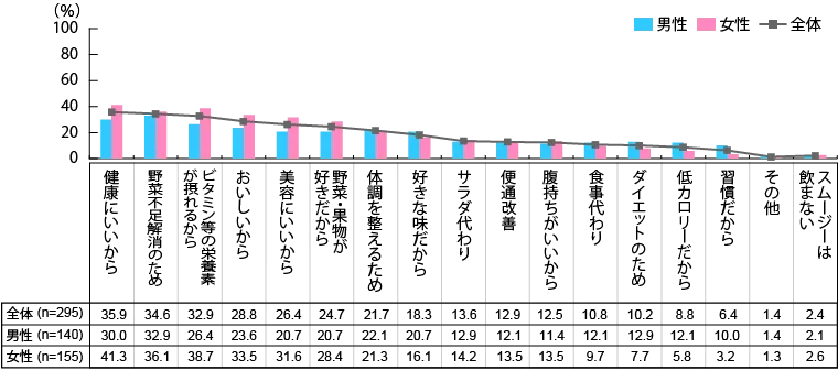 後者のスムージーを飲用する理由について、全体でみると「健康でいいから(35.9%)」がトップ、次いで「野菜不足解消のため(34.6%)」「ビタミン等の栄養素が摂れるから(32.9%)」となりました(図5)。「ビタミン等の栄養素が摂れるから」「美容にいいから」では女性のほうが男性より10ポイント以上高い結果となりました。