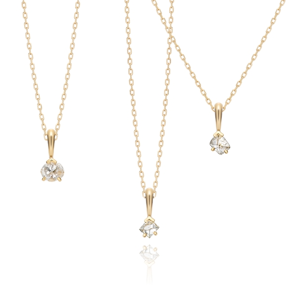 ケイ・ウノのダイヤモンド研磨の工程で生まれるたくさんの小さな原石を、あえてそのままの姿でネックレスにしました。原石の仕入れからカットまで自社で行うケイ・ウノならではのジュエリーです。