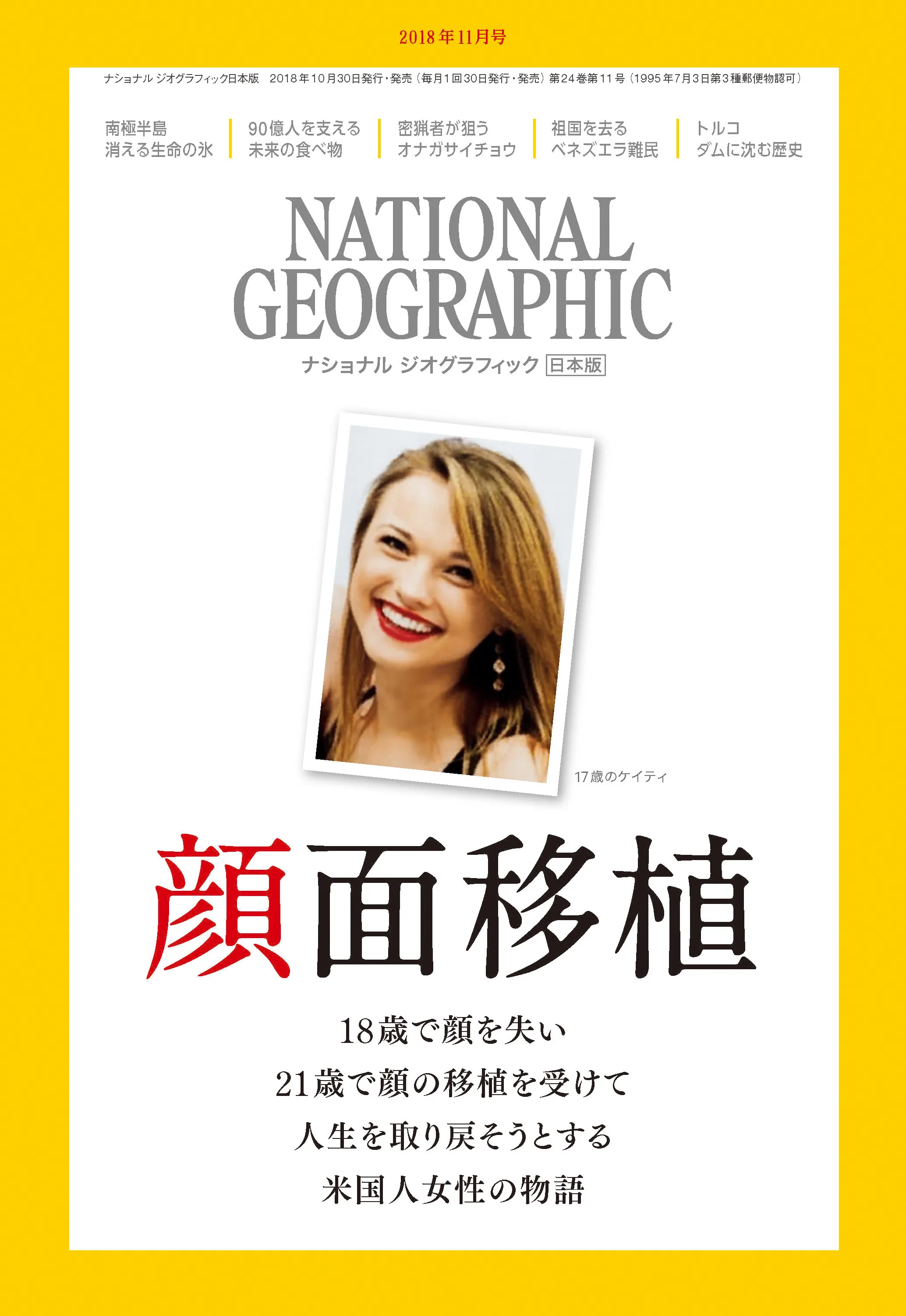 日経ナショナル ジオグラフィック社(代表:中村尚哉 、所在地:東京都港区虎ノ門)は、『ナショナル ジオグラフィック日本版2018年11月号』を10月30日(火)に発行します。今号の特集は、『顔面移植 ーケイティ、新しい顔で取り戻す人生』『南極半島 消える生命の氷』『どうなる? 未来の「食べ物」』『苦境のベネズエラ難民』『ダムに沈む歴史』シリーズ 鳥たちの地球から『オナガサイチョウ 狙われる東南アジアの珍鳥』の全6本です。