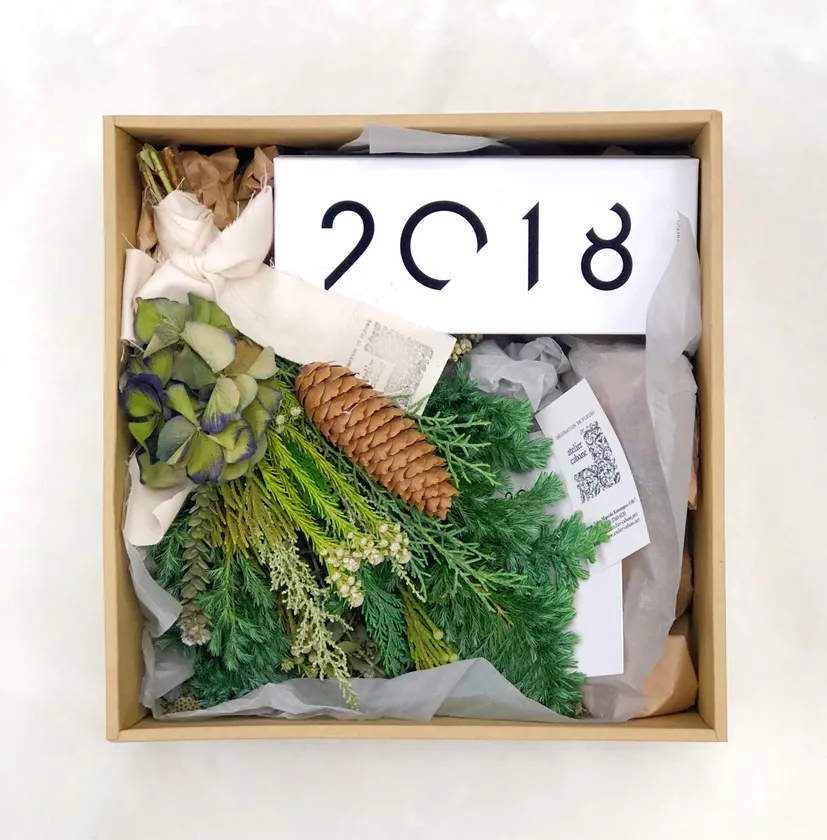 クリスマススペシャルボックスは、ギフトボックス入り「2.0.1.8オイルクラッシュウォーター」とatelier cabane(アトリエ・カバンヌ)様に特別にアレンジしていただいたフレッシュグリーンのスワッグをセットにしたクリスマスにぴったりのボックスとなっております。