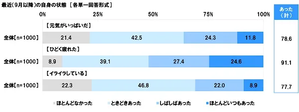 ◆最近の自身の状態 「ひどく疲れたことがあった」9割強 「イライラしていることがあった」約8割