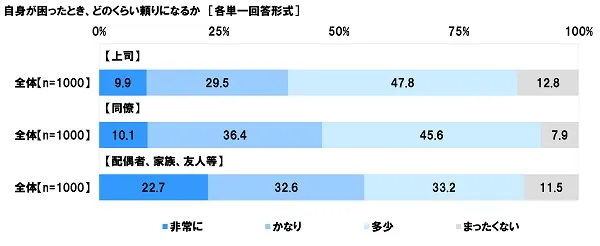 続いて、全回答者(1,000名)に、自身が困ったときに、周囲の人はどの程度頼りになるか聞いたところ、【上司】では「非常に」が9.9%、「かなり」が29.5%、「多少」が47.8%となった一方、「まったくない」が12.8%となり、【同僚】では「非常に」が10.1%、「かなり」が36.4%、「多少」が45.6%となった一方、「まったくない」が7.9%となりました。また、【配偶者、家族、友人等】では「非常に」が22.7%、「かなり」が32.6%、「多少」が33.2%となった一方、「まったくない」が11.5%となりました。
