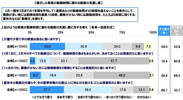 教員の約6割が「(変形労働時間制を導入すると)介護や子育て中の教員は困る」と回答