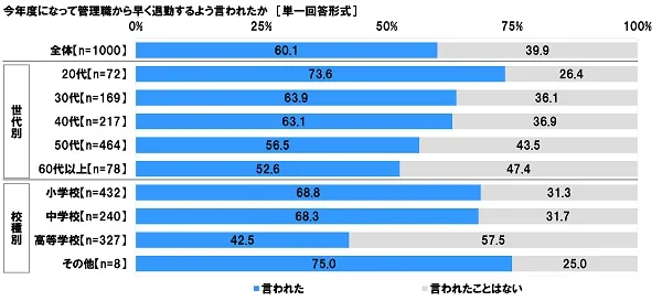 ◆教員の6割が「今年度になって管理職から早く退勤するように言われた」