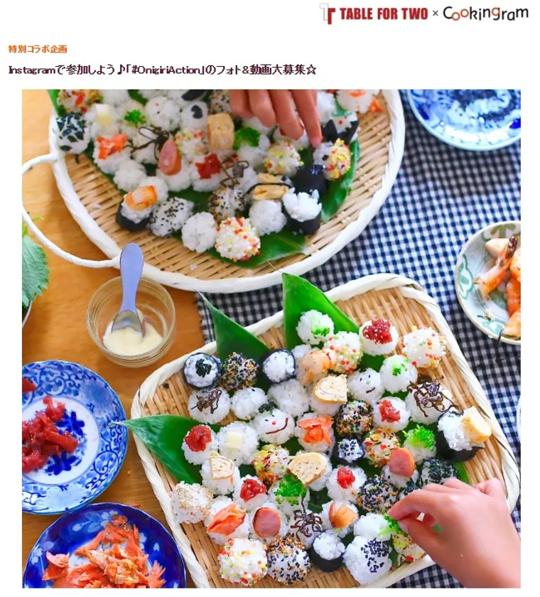 日本最大級の料理インスタグラマーコミュニティ「クッキングラム」( http://cookingram.jp/ 運営:アイランド株式会社、本社:東京都渋谷区、代表取締役:粟飯原 理咲)」は、この度、世界の食料問題の解決に取り組む特定非営利活動法人「TABLE FOR TWO International」(東京都港区、代表理事:安東 迪子、以下 TFT)が実施する「おにぎりアクション2018」の主旨に賛同し、自社サイトでの投稿キャンペーンとスペシャルワークショップイベントを開催する形で協賛いたします。