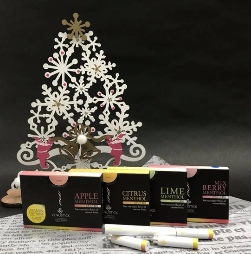 VENUSTICK(ヴィーナスティック)は、1つのカートリッジで約200回吸うことができます。本体はUSBで携帯電話のように充電できるので使い捨てに比べて、経済的で環境にも優しいです。【美容シリーズ】は『ビタミンC』と『プラセンタ』の2種類、【ボディメイクシリーズ】は『HMB』と『チラコイド』の2種類、香りと風味はオレンジ・ベリー・ライム・アップル・マスカットの5種類となっています。パッケージも女性に人気でオシャレなデザイン。吸うと先端のライトが点灯します。