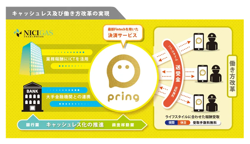 日本瓦斯株式会社(以下「ニチガス」)は、株式会社pring(「以下「pring」)が開発した、無料送金アプリ「pring(プリン)」を「日本瓦斯運輸整備株式会社」と「日本瓦斯工事株式会社」に導入いたしましたので、お知らせいたします。これにより、両社に従事する請負事業者は機動的な業務報酬の受け取りが可能となります。