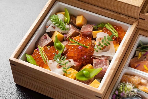 本プランでは朝食と夕食をお重仕立てで、提供します。夕食のメインは牛肉を使用したちらし寿司です。醤油や酒、みりん、昆布を使用した幽庵地で牛肉に味付けをし、しっかり染み込むよう低温で調理します。お肉の優しい味わいと、いくらや酢飯が重なり合って口の中に広がる一品です。シンプルなお重を開けると、鮮やかで華やかなお料理が目の前に並ぶので、味わいも見た目も楽しめます。客室で提供するので、プライベートにゆったりとした食事の時間を過ごせます。