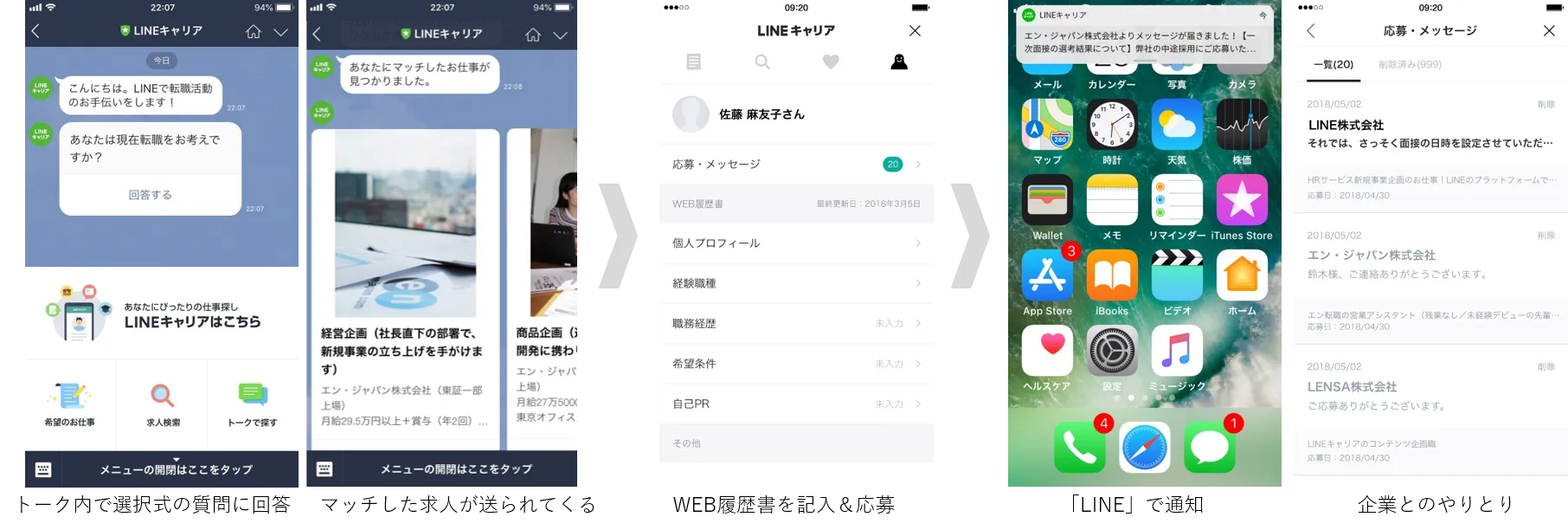 ・「LINE」内トークのみでweb履歴書作成、求人閲覧、検索、応募が可能に