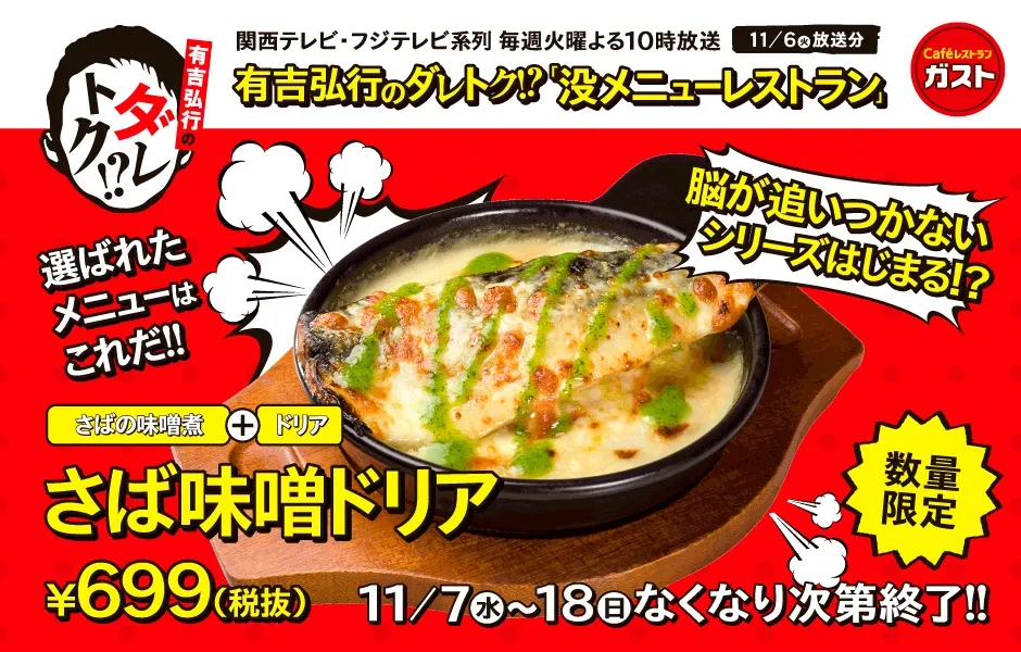 株式会社すかいらーくレストランツ(本社・東京都武蔵野市、代表取締役社長 崎田晴義)が運営する国内最大、全都道府県に店舗を構えるファミリーレストラン「ガスト」では、2018年11月7日(水)~11月18日(日)まで、『有吉弘行のダレトク!?』(関西テレビ・フジテレビ系列、毎週火曜よる10時放送)の「没メニューレストラン」で選ばれた「さば味噌ドリア」を期間限定・数量限定で発売いたします。