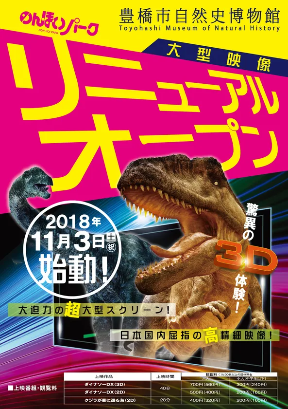豊橋市自然史博物館では、開館30周年記念の一環として、大型映像シアターのスクリーン及び映像機器を3D対応にリニューアルしたことをお知らせします。また、一般公開初日である11月3日(土・祝)には、佐原光一豊橋市長や、地元のパフォーマンスユニット「ええじゃないか豊橋伝播隊DOEE」、恐竜専門サイエンスコミュニケーターの「恐竜くん」をお迎えしての式典を実施します。