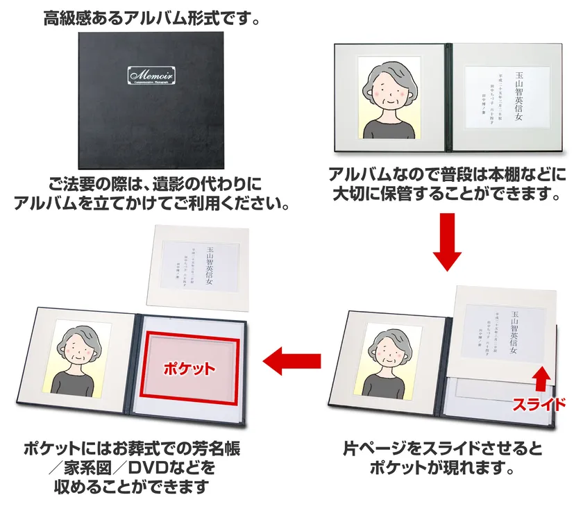 背表紙を表紙にくっつけるように開くことで、法事の際にはスマート遺影をそのまま額縁のかわりとして使用することができます。アルバム型なので持ち運びにも便利です。