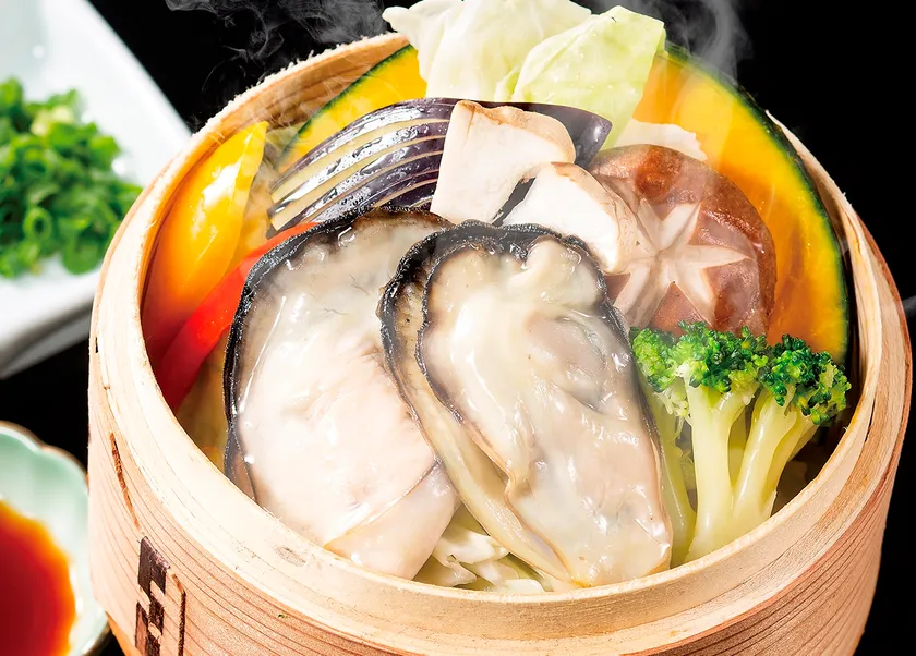 今回ご提供するのは「せいろ蒸し」。温かい一人前用の小さなせいろで季節の野菜と共にふっくら蒸し上げた牡蠣は、さっぱりとポン酢でいただくのがおすすめです。