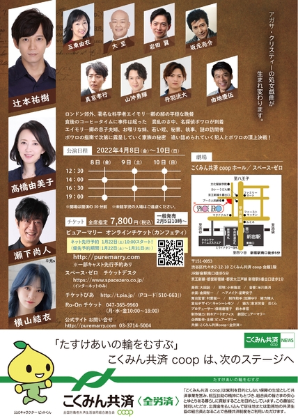 有限会社ピュアーマリー(代表:保坂 磨理子)主催、こくみん共済coop<全労済>文化フェスティバル2022参加、アガサ・クリスティー作、『新☆名探偵ポワロ』が、2022年4月8日 (金) ~2022年4月10日 (日)に、こくみん共済coopホール/スペース・ゼロ(東京都渋谷区)にて上演されます。チケットはカンフェティ(運営:ロングランプランニング株式会社、東京都新宿区、代表取締役:榑松 大剛)にて明日1月22日(土)より先行発売開始です。