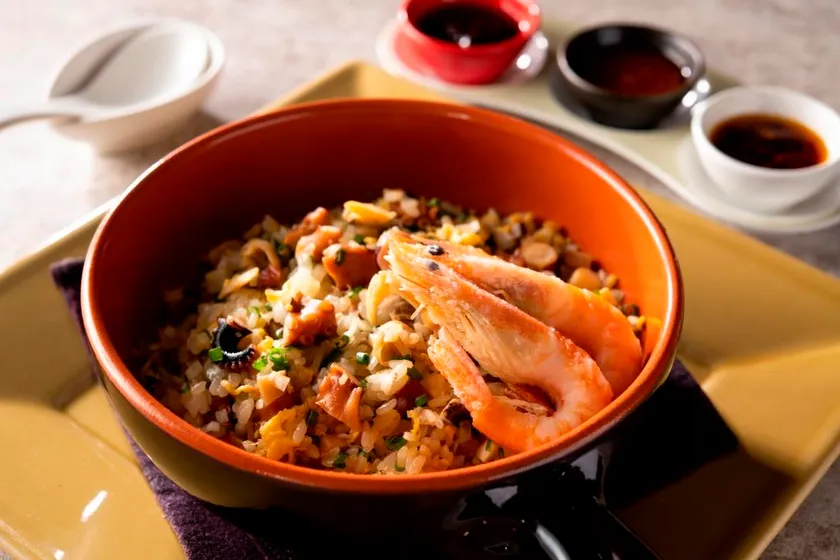有頭海老とアサリ、季節の野菜を使用した旨味あふれる海鮮炒飯を、熱々に熱した鍋焼きスタイルで提供いたします。同店オリジナルの3種の香り豊かな自家製辣油“山椒辣油(サンショウラーユ)”、“麻辣サテ醤(マーラーサテジャン)”、“蝦米香辣醤(ハーマイヒョンラージャン)”とともに、お好みの辛さを加えながら、様々な味の変化をお楽しみいただけます。