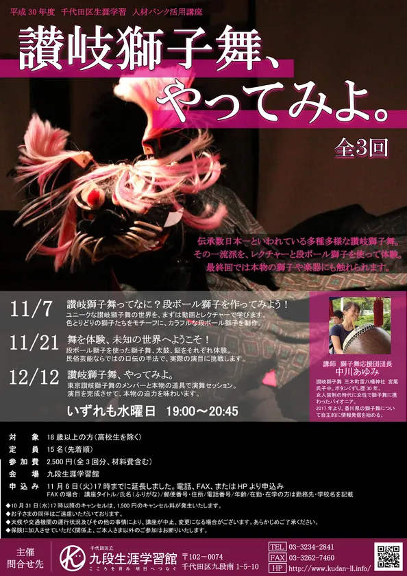 千代田区立九段生涯学習館は、人材バンク活用講座の一環として「讃岐獅子舞、やってみよ。」を2018年11月7日・21日、12月12日の<全3回>で実施いたします。