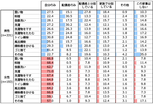 家事分担意識には男女差あり。男性は「配偶者と分担している」と思っている割合が高い一方、女性は「自分のみ」担当していると思っている割合が高い