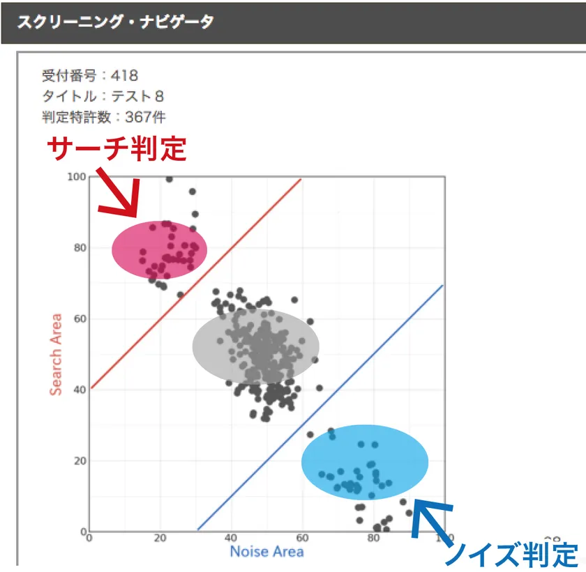新機能となる「スクリーニング・AIナビゲータ」は、特許評価に先立って特許データ全件を二種類の教師データに基づいてAI(人工知能)により判定処理し、判定結果を散布図表示により見える化することで視覚的な操作により、ノイズデータを除去することを可能にしました。これにより特許調査にかかる業務時間が大幅に短縮されます。