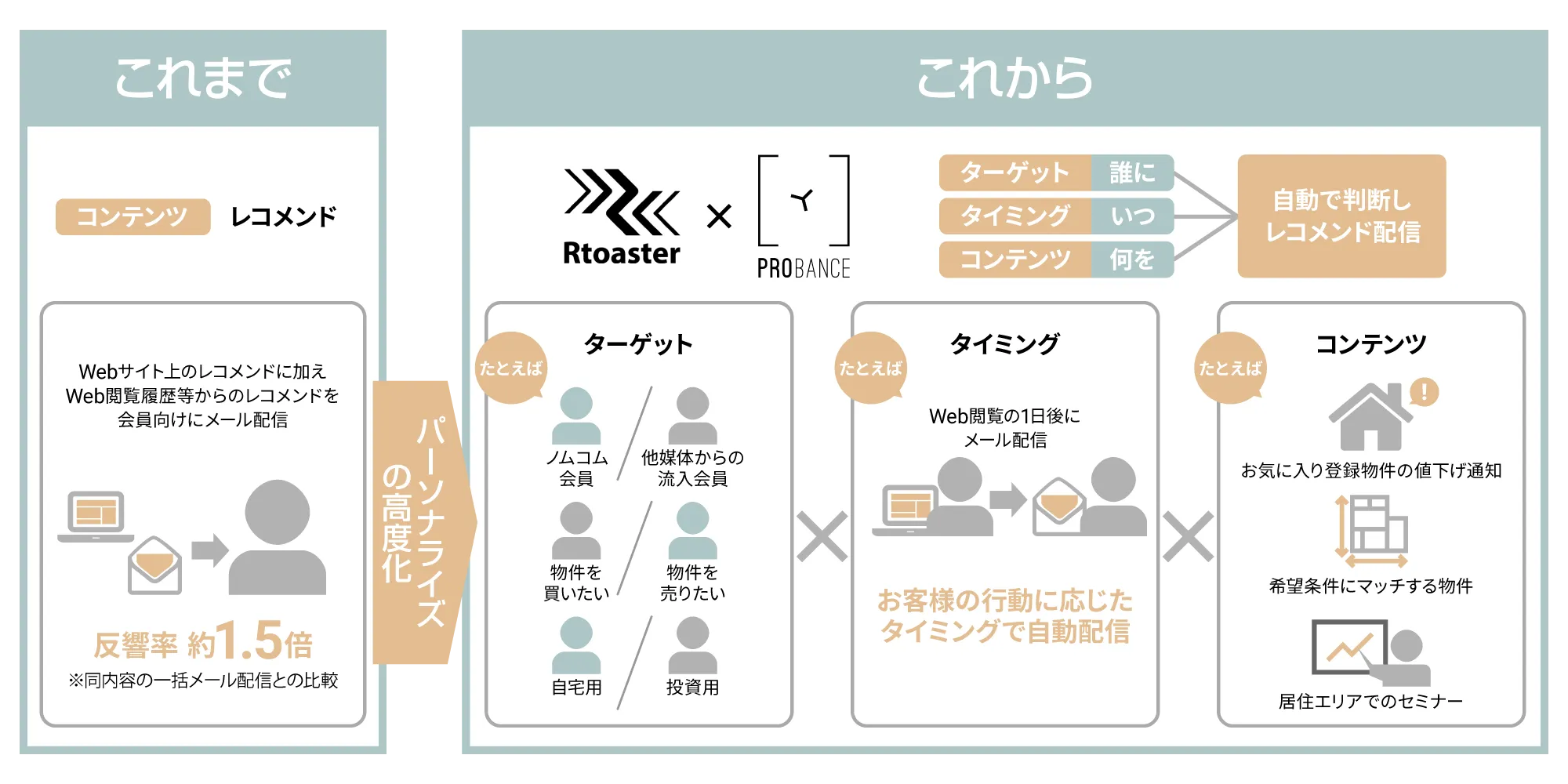 「ノムコム」は以前より、ブレインパッドが提供するレコメンドエンジン搭載プライベートDMP(*2)「Rtoaster(アールトースター)」を活用し、Webサイトの閲覧履歴等をもとに会員向けにおすすめの物件情報をメール配信していました。これにより同一の情報を手動配信する一斉メール配信と比較して1.5倍の反響効果が得られたため、さらなるパーソナライズの高度化のためにMA導入の運びとなり、「Rtoaster」での実績に加え、ブレインパッドの技術力・サポート力の高さが評価され、「Probance」が選定されました。