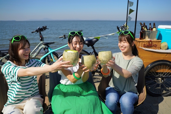 星野リゾート初の自転車を楽しむホテル「星野リゾート BEB5土浦」に、2021年6月1日、「メロンビアカーゴバイク」が登場します。大きなカーゴが付いた自転車に、凍ったメロンと冷えたビールを積み込み、霞ヶ浦までサイクリング。到着したら、湖畔のさわやかな風を感じながら、茨城が生産量日本一を誇るメロンをジョッキ代わりに、美味しいビールを楽しむアクティビティです。