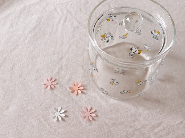 小さいスヌーピーとウッドストック、そしてお花が散りばめられた可愛いガラスのキャニスターです。