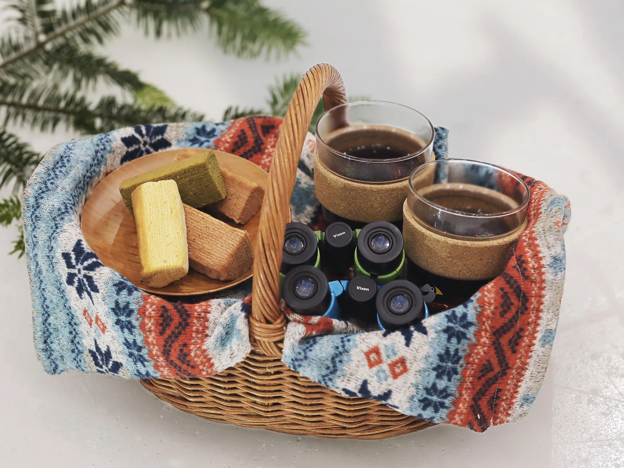 しばらくスケートを体験したら、スタッフが氷上のベンチにピクニックバスケットをお届けします。中には2名分のホットドリンク(コーヒー・ココア・ハーブティー・ホットミルクから選択)と、スイーツが入っています。スイーツは、森をイメージしたバウムクーヘン(=ドイツ語で「木の菓子」)です。バスケットから双眼鏡を取り出して、リンクにやってくる野鳥を眺めてみるのも一興です。