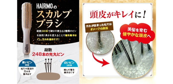 硬さ・長さの異なる2種類のピンを合計248本搭載。長いピンが毛穴や頭皮の汚れをもみ出し、短いピンが絡んだ髪をときほぐします。
