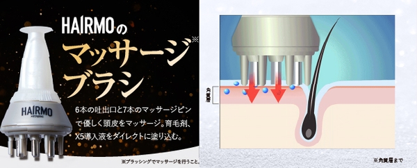HAIRMOは、「頭皮洗浄スカルプブラシ・育毛剤『IKUMO』・ヒト毛根細胞順化培養液X5導入液・頭皮マッサージブラシ」の4点セットで発毛を促進します。