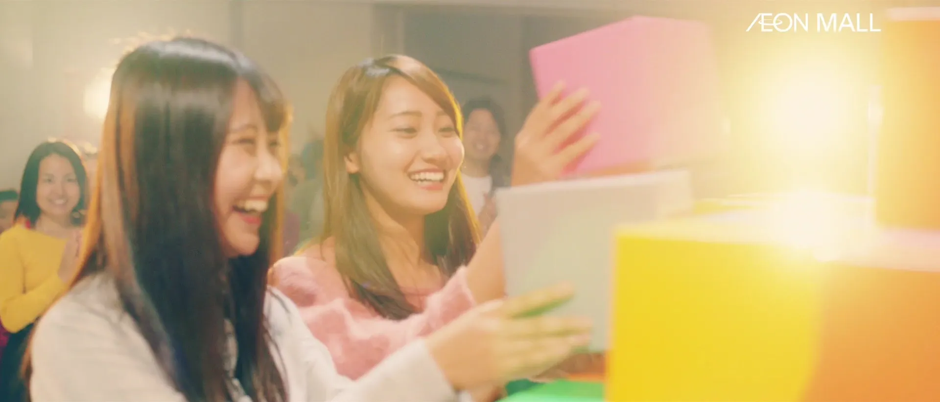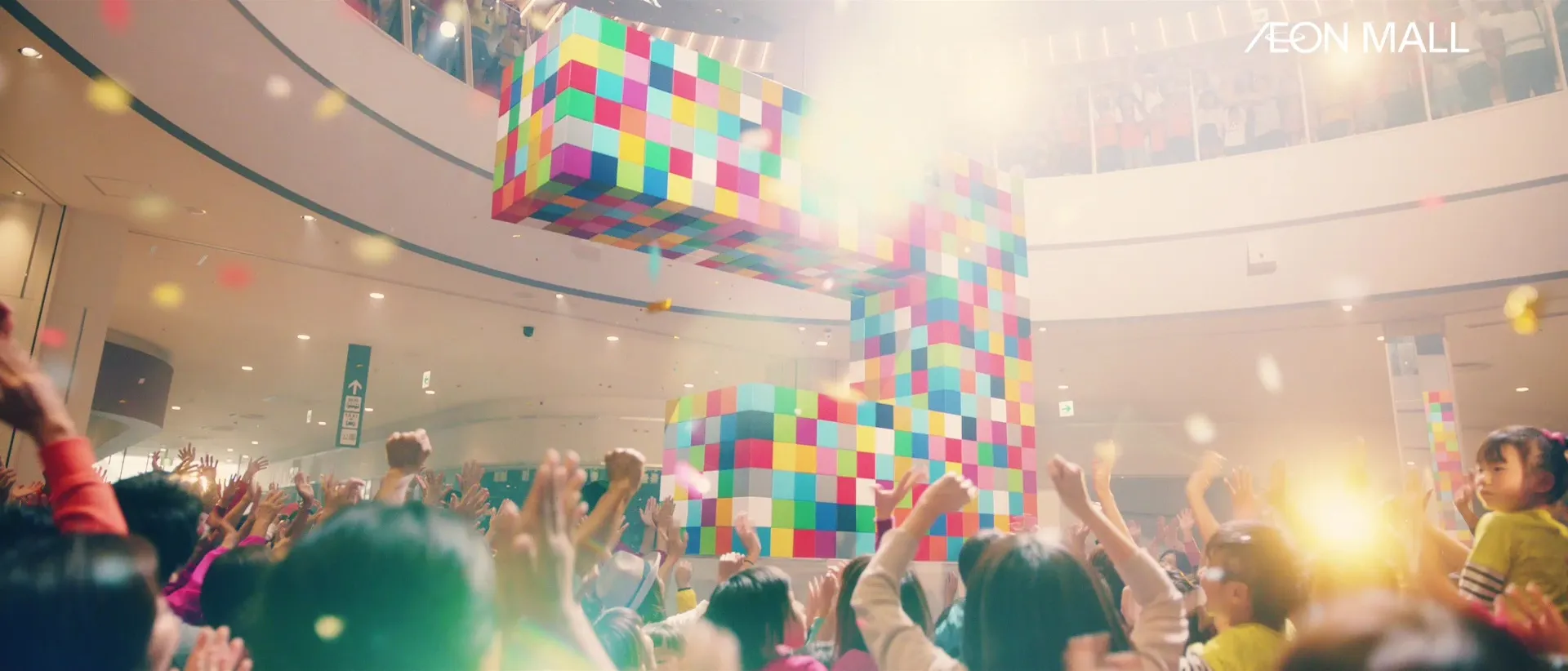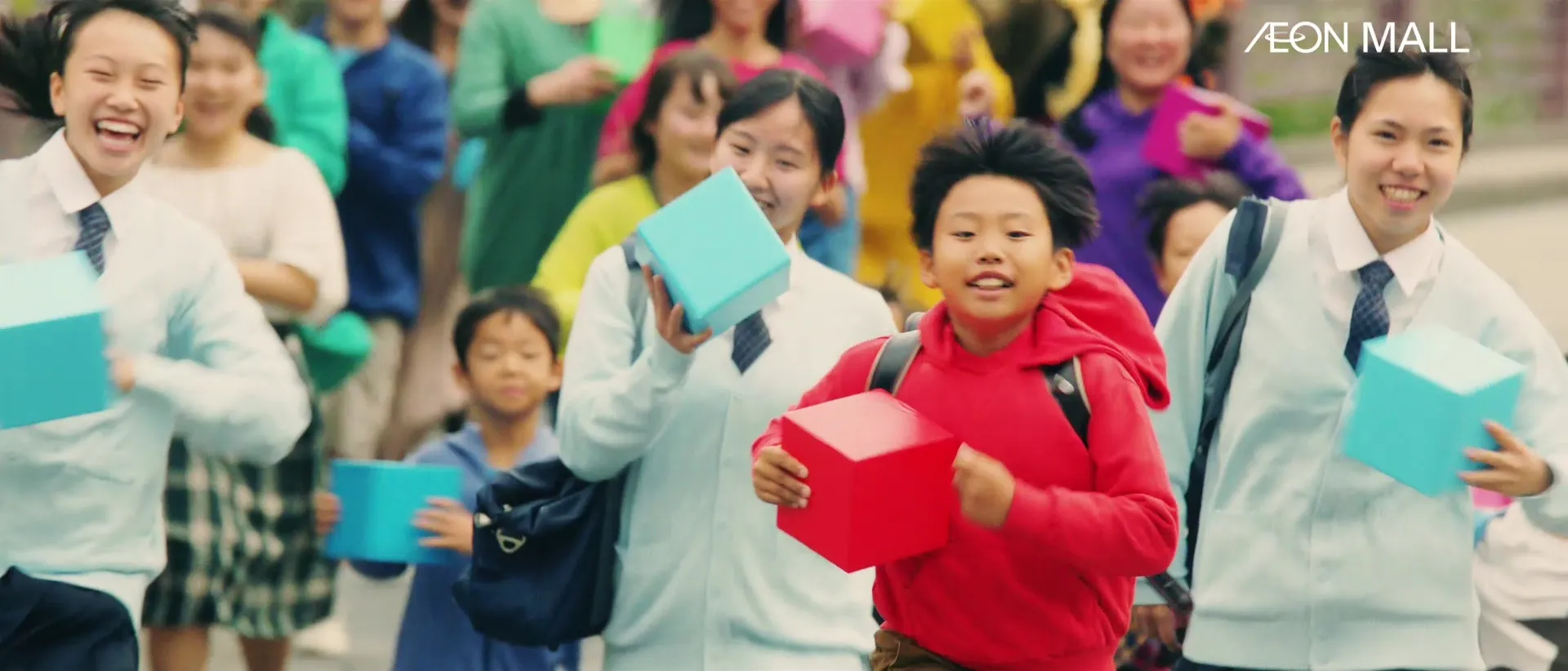 動画内で地域のみなさまが各々持っている色とりどりのキューブ(立方体)は、オープンを心待ちにしてくださっているお客さま一人ひとりの「想い」を表したもの。ランドセルを背負った小学生からお年寄りまでたくさんの人たちの「想い」が「イオンモール津南」に集まり、全員で「積み木(津み木)」のように積み重ねることで、大きな「つ」の形をしたモニュメントを作り上げます。カラフルで巨大な「つ」の文字が完成すると、会場である「イオンモール津南」は、大きな歓声に包まれます。地域のみなさまが楽しそうにCMに参加する様子にもご注目ください。