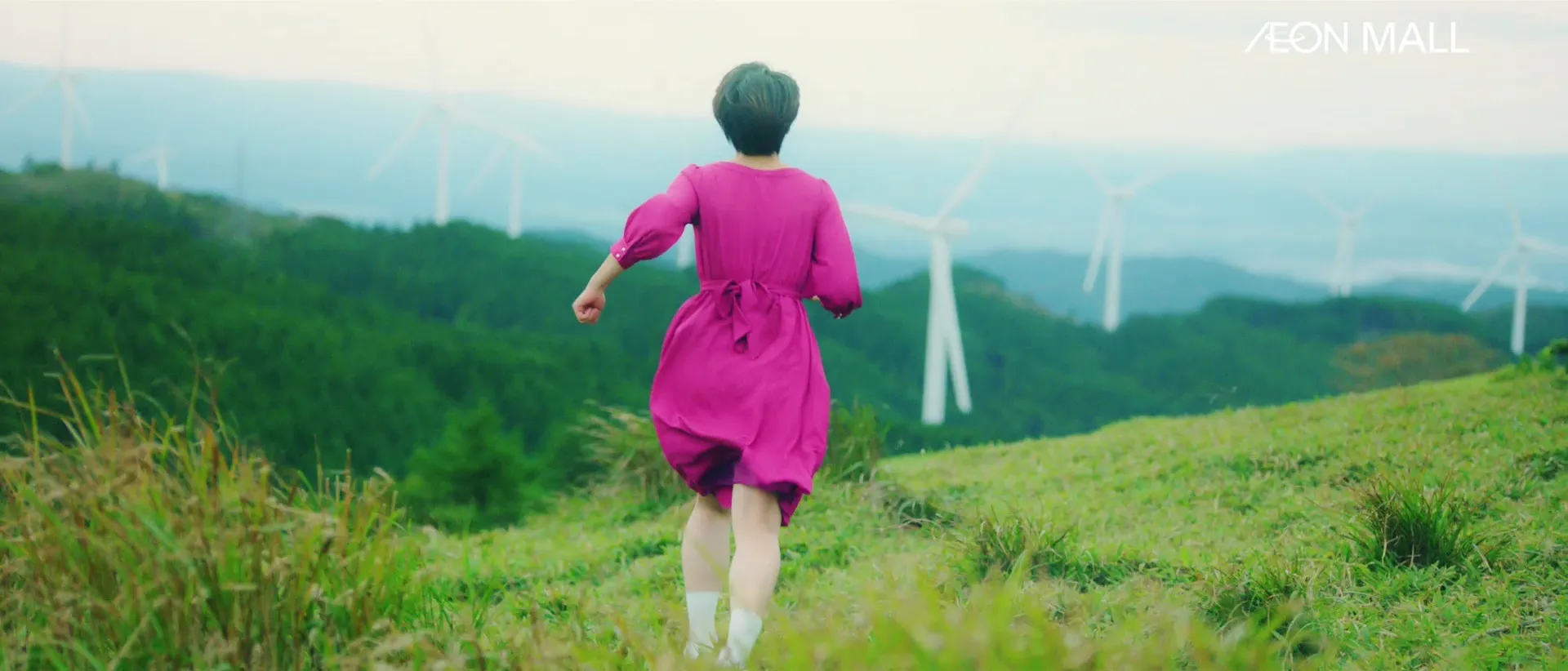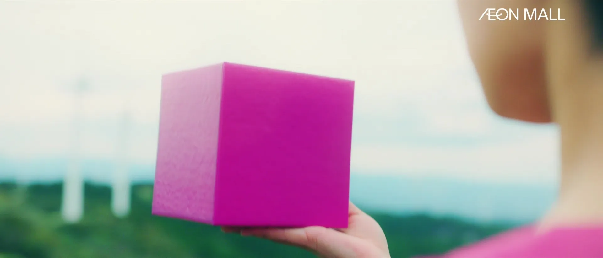 誰もいない静まり返った街の高台で、ピンクのキューブを見つめる女性。しばらく見つめた後、テンポの良いBGMと共に走り出します。