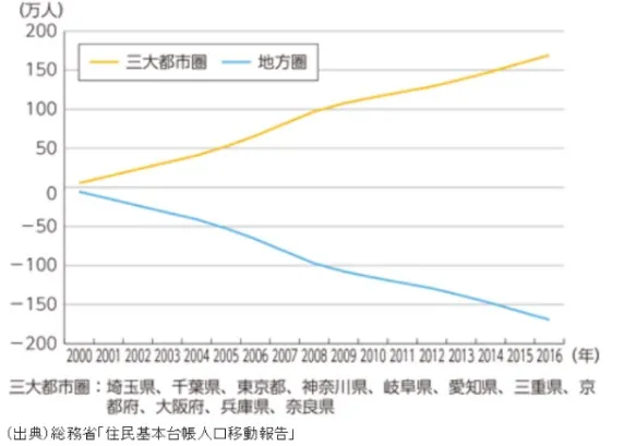 平成29年版情報通信白書[2]の参考データを見ると、近年地方圏から都市圏への人口流出が目立ちます。この傾向は各地域の活力低下をもたらすだけでなく、地方の若者が出生率の低い都市圏に移動することで日本全体としての人口減少に拍車をかけることになります。