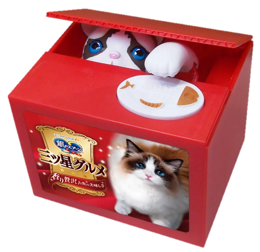 今回キャンペーンのために制作したオリジナル「いたずらBANK」は、銀のスプーンを思わせる赤い箱から、同商品のイメージキャラクターである「ラグドール」という種類のネコが箱から出てきてコインを持っていくというものです。