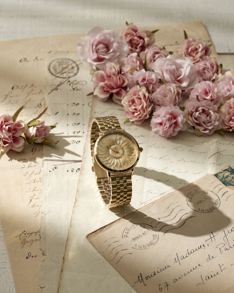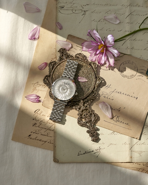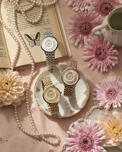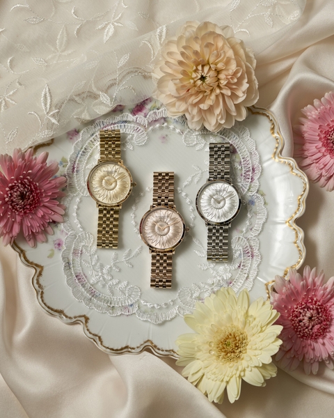 さらに、文字盤と同系色のメタルブレスレットを合わせることで、統一感のある上品な仕上がりとなっています。カラーバリエーションは、シルバー、ゴールド、ローズゴールドの3色展開。それぞれがモチーフの優美さを引き立て、シーンやスタイルに合わせて選べるラインナップです。