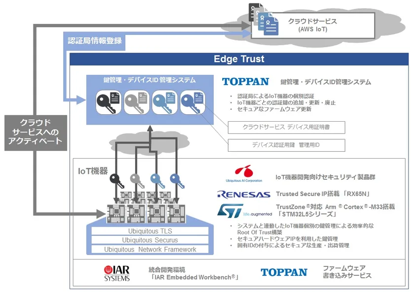 株式会社ユビキタスAIコーポレーション(本社:東京都新宿区、代表取締役社長:佐野 勝大、以下「ユビキタスAIコーポレーション」)と凸版印刷株式会社(本社:東京都千代田区、代表取締役社長:金子 眞吾、以下「凸版印刷」)は、IoT機器のライフサイクルマネジメントを中核としたセキュアなIoTサービスを実現するソリューション「Edge Trust(以下「本ソリューション」)」の提供を目的に協業し、機器メーカーやIoTサービス提供企業向けに2018年12月上旬より開発環境の提供及びベータサービスを開始、2019年3月末より本ソリューションの販売を開始する予定であることを発表します。