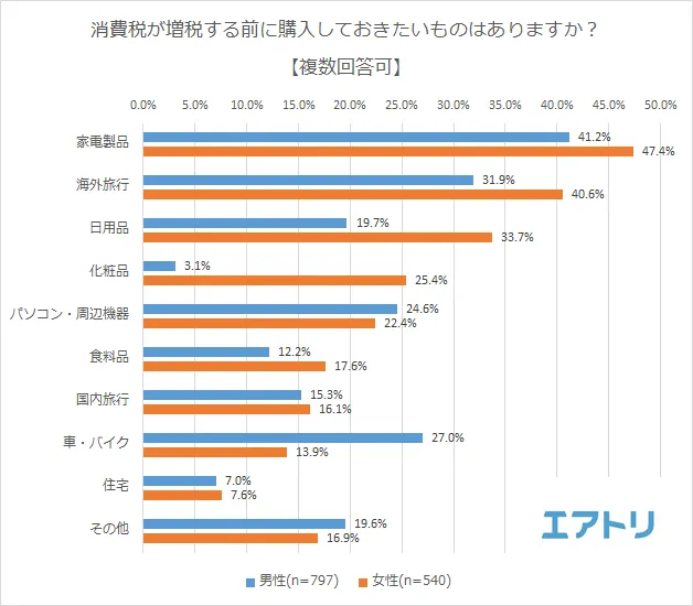 増税前に購入しておきたいものを聞いたところ、「家電製品(男性:41.2%、女性:47.4%)」が男女ともに1位となり、2位には「海外旅行(男性31.9%、女性:40.6%)」が選ばれました。3位以降より男女で差が表れ、男性と14.0%差で女性は「日用品(男性:19.7%、女性:33.7%)」が3位、女性と13.1%差で男性は「車・バイク(男性:27.0%、女性:13.9%)」が3位となりました。