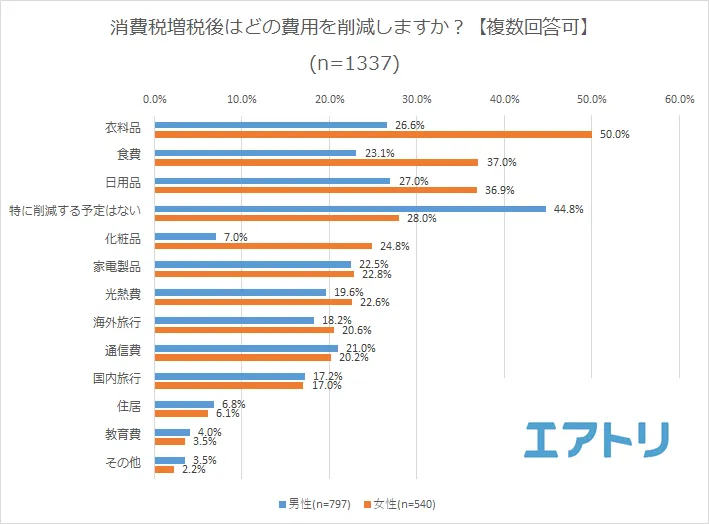 女性の回答が最も多かったのは「衣料品(男性:26.6%、女性:50.0%)」となり、半数が衣料品を削減しようと考えているようです。男性の回答が最も多かったのは「特に削減する予定はない(男性:44.8%、女性:28.0%)」となり、男女で大きく意識が異なることが分かりました。